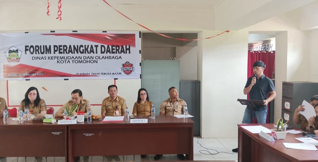 Dinas Pemuda dan Olahraga Kota Tomohon menggelar Forum Perangkat Daerah yang dilaksanakan di Ruang KONI pada Senin (17/2). Kegiatan ini dibuka secara langsung oleh Asisten 1 Pemkot Tomohon, ODS Mandagi, didampingi Kepala Dinas Pemuda dan Olahraga, Vence Karundeng.